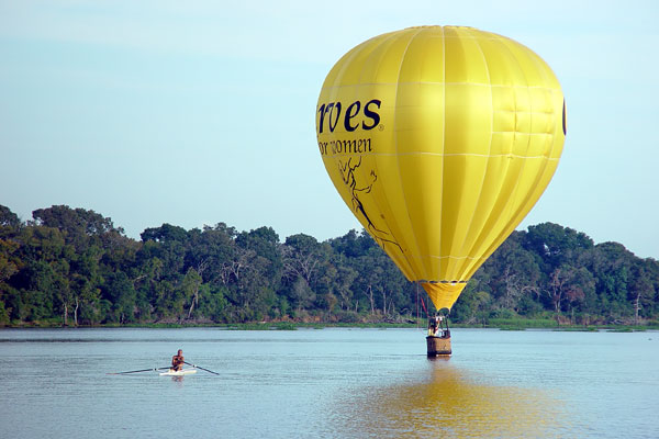 Sculling near a hot air balloon on the surface of Mud Lake (Lake Pasadena), during the Ballunar Liftoff Festival in Clear Lake, Texas. |